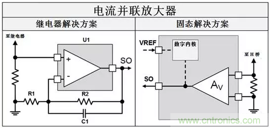 繼電器解決方案需要單獨的分立放大器電路來增加在檢測電阻上測量的電壓。