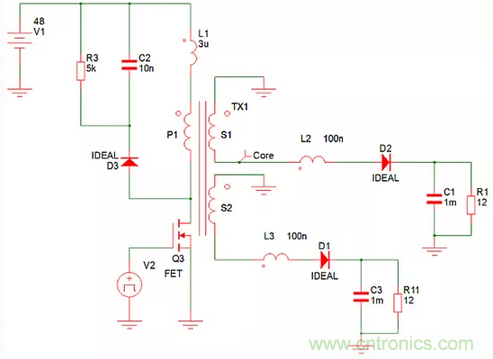 例如,一個反激式電源可分別從一個48V輸入產生兩個1 A的12V輸出,如圖1dejianhuafangzhenmoxingsuoshi。lixiangdeerjiguanmoxingjuyoulingzhengxiangyajiang,dianzukehulvebuji。bianyaqiraozudianzukehulvebuji,zhiyouyubianyaqiyinxianchuanliandejishengdiangancainengjianmo。zhexiedianganshibianyaqineideloudiangan,yijiyinshuadianluban(PCB)印製線和二極管內的寄生電感。當設置這些電感時,兩個輸出相互跟蹤,因為當二極管在開關周期的1-D部分導通時,變壓器的全耦合會促使兩個輸出相等。