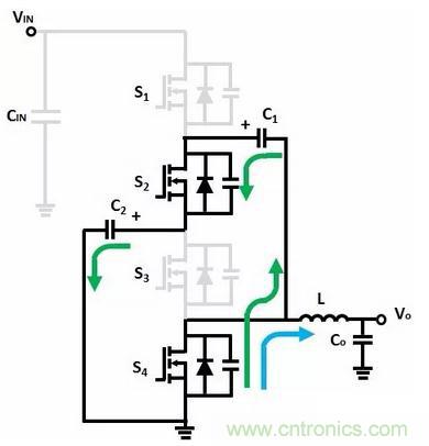 L1激磁,輸入電壓通過C1向輸出負載提供能量,同時對C1充電; L2去磁,S4續流。