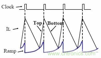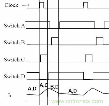 當輸入電壓比輸出電壓低△V時,開關管A保持常開,開關管B保持常關,開關管C和D工作於同步Boost模式。其工作原理與一般的同步Boost工作原理完全相同,控製的方法為峰值電流模式,如圖5所示。