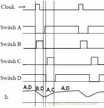 當輸入電壓比輸出電壓低△V,即輸入電壓略高於輸出電壓時,係統工作於降壓式BuckBoos模式。開關周期起始時,開關管B/D先同時導通,然後A/C同時導通,最後是A/D同時導通,即開關管導通的順序為:B/D–A/C–A/D。