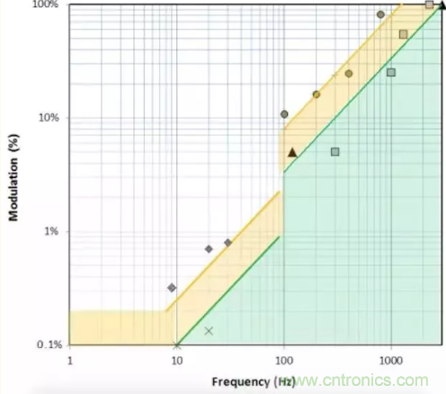 電氣和電子工程師協會1789-2015年標準首次提出降低人體健康風險的全麵建議。上圖顯示的是對人體健康風險較低或無明顯風險(綠色部分)的整個頻率範圍內的頻閃限值曲線。