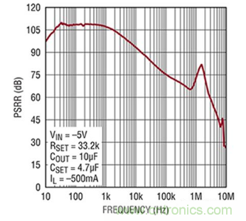 圖2:該圖顯示高性能LDO的PSRR頻率響應:在1kHz時,良好LDO的基準值介於60dB至110dB之間。(圖片來源:Analog Devices)