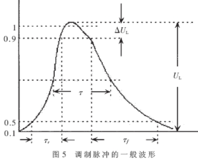 在(zai)理(li)想(xiang)情(qing)況(kuang)下(xia),脈(mai)衝(chong)調(tiao)製(zhi)器(qi)輸(shu)出(chu)的(de)脈(mai)衝(chong)應(ying)為(wei)矩(ju)形(xing),矩(ju)形(xing)脈(mai)衝(chong)頂(ding)部(bu)平(ping)坦(tan),脈(mai)衝(chong)持(chi)續(xu)期(qi)間(jian)雪(xue)崩(beng)管(guan)振(zhen)蕩(dang)器(qi)的(de)功(gong)率(lv)和(he)頻(pin)率(lv)穩(wen)定(ding)。但(dan)實(shi)際(ji)上(shang),由(you)於(yu)脈(mai)衝(chong)調(tiao)製(zhi)器(qi)中(zhong)不(bu)可(ke)避(bi)免(mian)地(di)存(cun)在(zai)有(you)寄(ji)生(sheng)參(can)量(liang),例(li)如(ru)分(fen)布(bu)電(dian)容(rong)、引線電感等,而其上的電壓、電流又是不能突變的,這就使得脈衝調製器不可能輸出理想的矩形調製脈衝,一般脈衝波形如圖5所示。