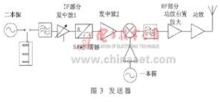 脈衝的擴展:165MHz的本振脈衝,經過開關截取0.1μs寬度的脈衝,經放大?帶通濾波後,得到一個鍾形脈衝,送到SAW擴展器。SAW擴展器的激勵脈衝可以是一個寬度小於8ns的窄脈衝,也可以是一個帶有載波的鍾形脈衝,為了得到較大的功率,在此選用了鍾形脈衝。