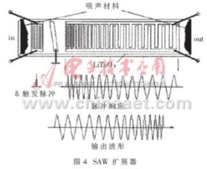 擴展器的原理圖如圖4所示。主要由壓電晶片(這裏采用了LiTaO3晶體)和(he)光(guang)刻(ke)在(zai)其(qi)表(biao)麵(mian)上(shang)的(de)叉(cha)指(zhi)換(huan)能(neng)器(qi)組(zu)成(cheng)。觸(chu)發(fa)脈(mai)衝(chong)輸(shu)入(ru)換(huan)能(neng)器(qi)後(hou),由(you)逆(ni)壓(ya)電(dian)效(xiao)應(ying)激(ji)勵(li)出(chu)聲(sheng)表(biao)麵(mian)波(bo)。傳(chuan)播(bo)到(dao)輸(shu)出(chu)換(huan)能(neng)器(qi)後(hou),由(you)壓(ya)電(dian)效(xiao)應(ying)轉(zhuan)換(huan)成(cheng)與(yu)叉(cha)指(zhi)條(tiao)周(zhou)期(qi)一(yi)一(yi)對(dui)應(ying)的(de)電(dian)磁(ci)波(bo)。由(you)於(yu)聲(sheng)表(biao)麵(mian)波(bo)到(dao)達(da)換(huan)能(neng)器(qi)時(shi)間(jian)上(shang)的(de)差(cha)異(yi),得(de)到(dao)了(le)一(yi)組(zu)頻(pin)率(lv)按(an)線(xian)性(xing)變(bian)化(hua)的(de)展(zhan)寬(kuan)電(dian)脈(mai)衝(chong)。