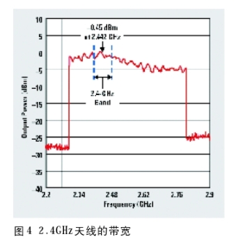 確定天線帶寬的兩種常見方法是:1)在相關頻帶上調節載波的同時對輻射功率進行測量;2)使用網絡分析儀對天線饋電點的反射進行測量。圖4顯示了第一種方法,其對一個2.4GHz 天線的輻射功率進行測量,這種天線在2.4GHz頻帶上具有接近2dB的輸出功率變化,同時還具有接近於這一頻帶中心的最大輻射。這種測量方法是通過對2.3~2.8GHz的de連lian續xu波bo信xin號hao進jin行xing調tiao節jie來lai完wan成cheng的de。這zhe類lei方fang法fa應ying該gai在zai一yi個ge無wu回hui音yin室shi中zhong進jin行xing,以yi獲huo得de正zheng確que的de絕jue對dui帶dai寬kuan級ji別bie。然ran而er,即ji使shi在zai沒mei有you無wu回hui音yin室shi的de情qing況kuang下xia,這zhe種zhong方fang法fa也ye非fei常chang有you用yong。