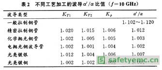 由Benson和AILison對各種不同工藝加工的口徑為25.4mm×12.7mm銅波導管,測出KT1,KT2,Kp之後,據上式算出的α′/α之值見表2[1]。[page]