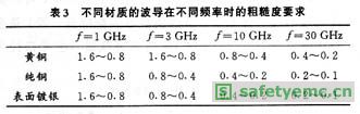 波導表麵粗糙度越低,加工難度越大,製造成本也越高。為了降低成本、提高經濟效益,在不同頻段,控製波導管表麵粗糙度的要求是不同的。頻率越高,波長越小,粗糙度值要求也越低。表3為實際工作中總結出的銅、黃銅、鍍銀波導在不同頻率時的粗糙度要求,可作為設計時的依據。