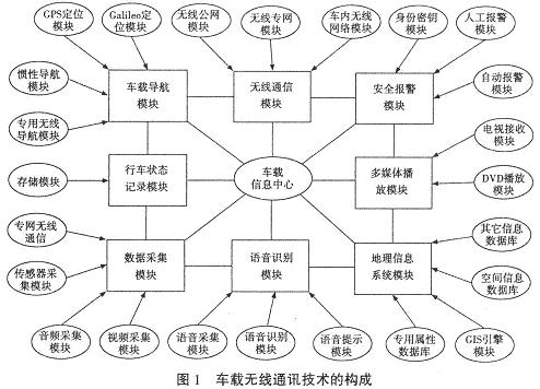 車載無線通訊技術由車載導航模塊、車載無線通信模塊、安全報警模塊、行車狀態記錄模塊、多媒體播放模塊、數據采集模塊、語音識別模塊、地理信息係統模塊八部分組成。所有的數據都通過車載信息中心進行處理、協調,並作出正確的反應。圖l為車載無線通訊技術的構成。