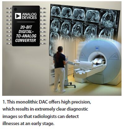 諸如MRI等成像設備的使用普及率在增加,目前全球每年要實施超過6千萬例MRI診斷。它們通常用於診斷阿爾茨海默氏症(老年癡呆症)、癌症細胞和韌帶撕裂等各種疾病和損傷。成像係統采用了多種射頻/微波器件,包括振蕩器、發射器和天線。例如,ADI公司現在就提供一款為提高成像分辨率而設計的20位數據轉換器(DAC)AD5791。