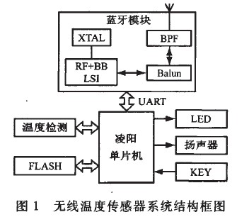 無線溫度傳感器主要由單片機控製單元、藍牙模塊、溫度檢測單元、接口電路及其它輔助電路組成,係統結構如圖1所示。控製單元淩陽單片機為整個係統的核心,對檢測到的溫度數據進行轉換、顯示、傳輸,外擴4MBFLASH用於存儲程序和溫度數據。藍牙模塊包括藍牙芯片、放大器、非平衡變壓器(Balun)等,負責與藍牙控製終端進行無線連接和數據傳輸,按鍵完成係統設置、複位等信息輸人,測量的溫度數據在傳輸到控製終端的同時在LED上顯示,並通過揚聲器定時語音播報當前溫度數據和超限報警。