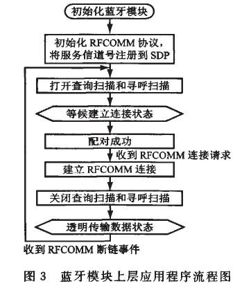 本係統是基於藍牙的串口應用模型SPP(SerialPortProfile)實現無線數據的透明傳輸,在核心協議棧之上編寫自己的上層應用程序。CSR的藍牙核心協議棧包括HCI、LZCAP、SDP、RFCOMM等,以固件的形式提供給開發人員,用戶編寫的應用程序和協議棧一起運行在CSR嵌人式環境中。在CSRchengxuzhong,butongrenwuzhijiankeyiyibudifasongxiaoxi,meiyigerenwuzaichuangjiandeshihoukeyirangqizhongyigeyongyouxiaoxiduilie,qitadejiubafageirenwudexiaoxitijiaogeigaixiaoxiduilie,yourenwutiaoduchengxuzidongyunxinghuoderenwudexiaoxi。lanyamokuaishangcengyingyongchengxuliuchengrutu3所示。