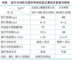 膠片冷卻機與密煉機、壓(ya)片(pian)機(ji)配(pei)套(tao)使(shi)用(yong)。將(jiang)密(mi)煉(lian)機(ji)煉(lian)好(hao)的(de)塑(su)煉(lian)膠(jiao)或(huo)混(hun)煉(lian)膠(jiao),經(jing)壓(ya)片(pian)後(hou),膠(jiao)片(pian)進(jin)入(ru)該(gai)機(ji)進(jin)行(xing)浸(jin)泡(pao),塗(tu)隔(ge)離(li)劑(ji)後(hou)進(jin)入(ru)掛(gua)杆(gan),經(jing)冷(leng)卻(que)幹(gan)燥(zao),最(zui)後(hou)進(jin)行(xing)連(lian)續(xu)疊(die)片(pian)。這(zhe)種(zhong)膠(jiao)片(pian)冷(leng)卻(que)機(ji)是(shi)集(ji)日(ri)本(ben)、英國、台灣等廠家的長處為一體,增加自主創新抓膠片的機械手部分,傳動裝置全部采用日本富士交流變頻器,實現抓膠片自動化、傳動調速同步化的自動控製係統。膠片冷卻機與國外同類機型主要技術參數對照表如附表所示。