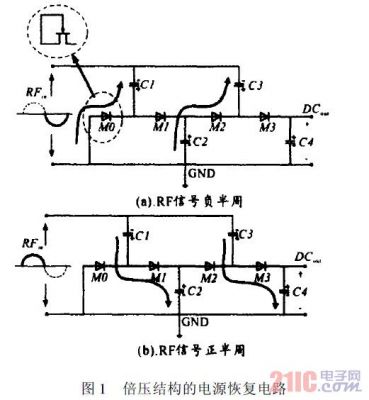 倍壓結構的電源恢複電路如圖1所示。圖中的二極管在實際應用時通常用MOS管替代。輸入正弦交流信號RFin=VAsint。在RFin負半周期時,M0導通,C1充電。C1兩端能夠獲得的最大電壓為VA-Vd,其中,Vd為MOS管M0兩端的電壓降。