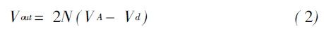 RFin正半周期時,節點1的最大電壓為VA+(VA-Vd)。該電壓使得M1導通,C2充電,直到C2兩端達到最大電壓,即節點2的最大電壓,為VA+(VA- Vd)-Vd=2(VA-Vd)。依次類推,C3兩端能夠獲得的最大電壓為3(VA-Vd),節點4的最大電壓為4(VA-Vd)。節點2N的最大電壓為 2N(VA-Vd)。於是,對於2N級電路,輸出直流電壓為:
