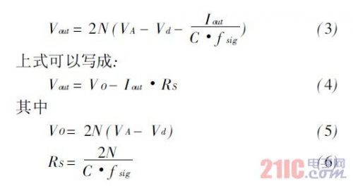 考慮輸出負載的情況。假設負載抽取電流為Iout,輸入交流信號頻率為fsig,所有電容值都為C,則輸出電壓降低2NIout/Cfsig。於是,考慮輸出負載情況下的輸出電壓為: