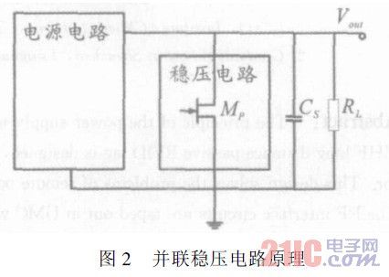 通常的並聯式穩壓結構如圖2所示。當Vout大於穩壓電路開啟閾值時,穩壓電路內的瀉流管Mp開啟,從瀉流管瀉放電流,使電壓降低。
