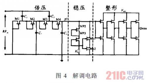 解調電路如圖4所示。M1~M4 為4級倍壓單元,起到檢波二極管的作用。由於並聯穩壓電路的瀉流管無法瞬間關斷,因此,在OOK信號關斷時刻,瀉流管抽取電容C4上的電荷。電容C4取值較小,因此,p1點電平迅速下降,形成較大的下脈衝凹陷,經過後級的整形電路,輸出標準的解調波形。