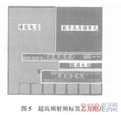 該射頻前端模塊作為超高頻長距離無源射頻標簽芯片的一部分,在UMC0.18m混合信號工藝下設計實現,並流片驗證。芯片照片如圖5所示。