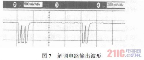讀寫器發送1s脈寬的OOK調製信號。解調電路輸出波形如圖7所示。下脈衝上升時間較長是由於示波器探頭引入的16pF電容所致。
