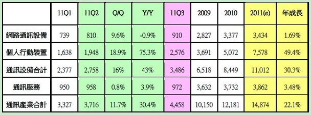 其(qi)中(zhong)個(ge)人(ren)行(xing)動(dong)裝(zhuang)置(zhi)市(shi)場(chang)仍(reng)是(shi)以(yi)手(shou)機(ji)產(chan)品(pin)為(wei)主(zhu)要(yao)成(cheng)長(chang)動(dong)能(neng),而(er)第(di)二(er)季(ji)起(qi)廠(chang)商(shang)開(kai)始(shi)推(tui)出(chu)雙(shuang)核(he)心(xin)或(huo)不(bu)同(tong)作(zuo)業(ye)係(xi)統(tong)之(zhi)產(chan)品(pin)來(lai)吸(xi)引(yin)消(xiao)費(fei)者(zhe)。因(yin)此(ci)整(zheng)體(ti)通(tong)訊(xun)設(she)備(bei)產(chan)業(ye)在(zai) 2011年第二季之產值為2,758億新台幣,較2011年第一季成長16%,較2010年第二季成長約43%。