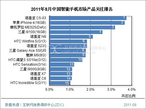 yiwangzhongguozhinengshoujishichangshang,qianshiwudazuishouyonghuguanzhudechanpinzhong,nuojiyazhishaozhanjushigeyiqianxiwei,errujin,suizhejiaruzhinengshoujilingyujingzhengduishoudezengjia,nuojiyadexirishengjingyijingnanzaixian。ZDC監測數據顯示,2011年8月中國智能手機市場上,最受用戶關注的十五款產品中,諾基亞僅有五款產品上榜,且冠軍產品C5-03領先優勢並不明顯,被競爭對手緊咬。