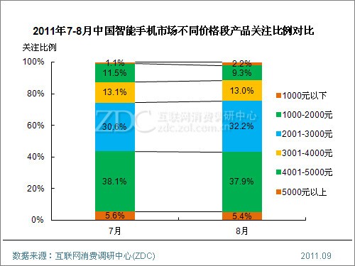 ZDC統計數據顯示,2011年8月,在暑促效應影響下,諸多中高端智能機型價格下調,1000-3000元價格段智能手機用戶關注度達到七成,較上月上升1.3%。3000元以上高端智能手機關注度則相應出現小幅下降。