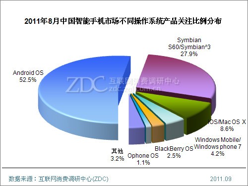 ZDC數據顯示,2011年8月中國智能手機市場上,搭載Android操作係統的智能手機用戶關注度已經達到52.5%,較上月再度攀升2個百分點。而諾基亞Symbian係統智能手機的關注度則持續下滑,本月跌破三成。其他操作係統產品關注比例變動幅度不大。