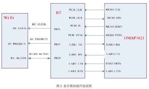 AFH技術在上麵已經介紹過了,單獨使用AFH技術使用藍牙耳機的通話效果不是很好,為了解決這種問題,在使用AFH技術的基礎上又使用了三線共存(時分複用)技術。三線共存,顧名思義,就是使用三根線連接Wi-Fi和藍牙,下麵結合圖3中Wi-Fi和藍牙所示的三線連接圖來描述一下三線共存的機製,其中主處理器使用的是TI公司的OMAP1621芯片。