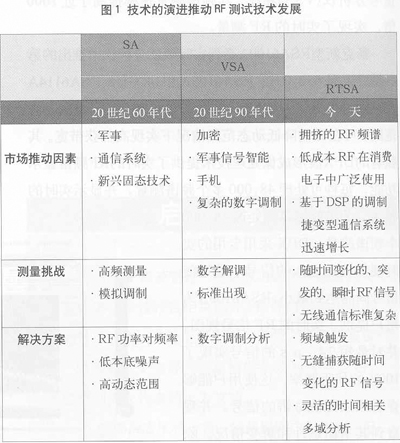 19世紀60年代,James Maxwell 通過計算推斷出存在著能夠通過真空傳輸能量的電磁波。此後工程師和科學家們一直在尋求創新方法利用無線電技術。接下來,隨著軍事和通信領域技術的深入發展,20世紀無線電技術一直在不斷創新,技術的演進也推動著RF測試技術向前發展(見圖1)。從軍用的跳頻電台、雷達到RFID,第三代移動通信、藍牙、WLAN,各種微功率發射裝置等,瞬態信號如今無處不在。瞬態信號存在的普遍性使得技術人員需要有效的儀器對其進行捕獲、存儲並回放分析。另外,監測間歇性幹擾或頻譜使用情況等也需要一種有效的手段來實現“寬帶實時監測”。