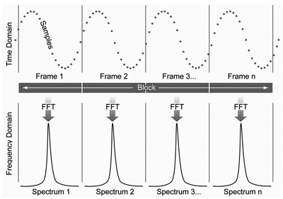 上一層是幀,幀由整數個連續樣點組成,是可以應用快速傅立葉變換(FFT)把時域數據轉換到頻域中的基本單位。在這一過程中,每個幀產生一個頻域頻譜。