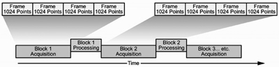 圖5是(shi)塊(kuai)采(cai)集(ji)模(mo)式(shi),可(ke)以(yi)實(shi)現(xian)實(shi)時(shi)無(wu)縫(feng)捕(bu)獲(huo)。對(dui)塊(kuai)內(nei)部(bu)的(de)所(suo)有(you)幀(zhen),每(mei)個(ge)采(cai)集(ji)在(zai)時(shi)間(jian)上(shang)都(dou)是(shi)無(wu)縫(feng)的(de)。在(zai)一(yi)個(ge)采(cai)集(ji)塊(kuai)中(zhong)的(de)信(xin)號(hao)處(chu)理(li)完(wan)成(cheng)後(hou),將(jiang)開(kai)始(shi)采(cai)集(ji)下(xia)一(yi)個(ge)塊(kuai)。塊(kuai)存(cun)儲(chu)在(zai)內(nei)存(cun)中(zhong),可(ke)以(yi)應(ying)用(yong)任(ren)何(he)實(shi)時(shi)測(ce)量(liang)。例(li)如(ru),實(shi)時(shi)頻(pin)譜(pu)模(mo)式(shi)下(xia)捕(bu)獲(huo)的(de)信(xin)號(hao)可(ke)以(yi)在(zai)解(jie)調(tiao)模(mo)式(shi)和(he)時(shi)間(jian)模(mo)式(shi)下(xia)分(fen)析(xi)。