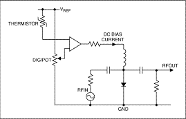 有些係統可能需要進行溫度補償(圖3),簡化電路中,數字電位器IC建立固定或可調偏置電平,熱敏電阻提供溫度輸入。這兩個輸入連接到運算放大器,產生的輸出通過一個電阻驅動PIN二極管。