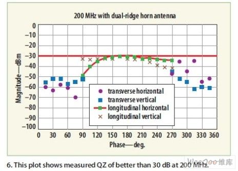 suirancongqianmiandetaolunzhongkeyiqingchudizhidao,zaidipinshizhuixinganshikeyibijuxinganshitigonggengduodeyoushi,danceliangshujubiaomingzhuixinganshijuyouzhenzhengdekeyongxing。tu5 是一個200MHz至40GHz的小型錐形暗室,外形尺寸為12×12×36英尺,靜區大小為1.2米。這裏采用了一個雙脊寬帶喇叭天線照射較低頻率的靜區。然後利用安捷倫(Agilent)公司的N9030A PXA頻譜分析儀以一個對數周期天線測量靜區。在200MHz點測得的反射率大於30Db(如圖6所示)。圖7 和圖8分別顯示了饋源頂部的源天線和靜區中的掃描天線。