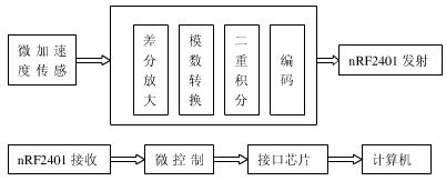 鼠標在人的操縱下移動,微加速度傳感器便會實時地輸出鼠標運動的加速度大小和方向,ADXL203傳感器的量程為±1.7gn ,電壓靈敏度為1000mV/gn,這個電壓信號經過差分放大5.0/1.7倍後,通過微控製器A/D轉換功能變成與加速度大小對應的數字信號,加速度經過兩次積分,便變成了鼠標移動的位移信號,然後,再經過編碼,並通過nRF2401射頻收發器將位移信號發射出去。