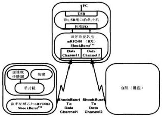 nRF2402是單片2.4 ~2.5GHz射頻發射芯片, 發射器包含頻率合成器、功放、晶體振蕩器和調製器 ,輸出功率和信道選擇很容易通過3-線接口編程實現, 在輸 出功率為-5dBm時電流消耗僅10mA ,內置的ShockBurst技術以及休眠模式用來降低發送數據的電流消耗 ,以延長電池使用壽命 ,並且向pc發送的數據包也應盡可能少(取采樣速率為100采樣點/秒)。ShockBurst技術使用片內先入先出堆棧(FIFO)低速處理數據(10Kbps)而高速發送數據(1Mbps)。