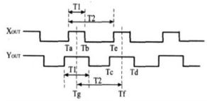 為了實現高精度測量,考慮到T2易受溫度漂移的影響,必須周期性地更新T2的平均值。一種新的改進型脈寬調製(PWM)解碼方法是通過占空比調製在X軸和Y軸使用相同的三角形參考波 ,使得每個周期中 T1的中點達到同步 ,這種方法能加快數據傳輸時間,也稱之為高速解碼,X軸和Y軸的占空比輸出如圖2所示。