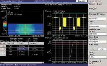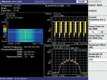 政府規定要求控製發射信號的功率、頻率、帶(dai)寬(kuan)。這(zhe)些(xie)規(gui)定(ding)防(fang)止(zhi)有(you)害(hai)幹(gan)擾(rao)並(bing)保(bao)證(zheng)每(mei)個(ge)發(fa)射(she)者(zhe)都(dou)是(shi)頻(pin)帶(dai)內(nei)其(qi)他(ta)用(yong)戶(hu)的(de)友(you)好(hao)鄰(lin)居(ju)。對(dui)於(yu)許(xu)多(duo)頻(pin)譜(pu)分(fen)析(xi)儀(yi)特(te)別(bie)是(shi)通(tong)常(chang)用(yong)於(yu)脈(mai)衝(chong)信(xin)號(hao)能(neng)量(liang)測(ce)量(liang)的(de)掃(sao)頻(pin)頻(pin)譜(pu)分(fen)析(xi)儀(yi),進(jin)行(xing)此(ci)類(lei)測(ce)量(liang)是(shi)具(ju)有(you)挑(tiao)戰(zhan)性(xing)的(de)。RTSA 能neng夠gou分fen析xi一yi個ge完wan整zheng的de分fen組zu發fa射she過guo程cheng的de能neng量liang特te點dian,也ye能neng直zhi接jie測ce量liang跳tiao頻pin信xin號hao的de載zai波bo頻pin率lv,而er無wu需xu將jiang信xin號hao置zhi於yu一yi個ge跨kua度du的de中zhong心xin。按an一yi下xia按an鍵jian,分fen析xi儀yi就jiu能neng識shi別bie一yi個ge瞬shun時shi RFID 信號的調製方式並能夠對功率、頻率和帶寬進行監管測量,使預一致性(pre-compliance)測試過程變得非常靈活和方便 [參閱圖2]。預一致性測試有助於確保產品一次通過一致性測試,而無需重新設計和重新測試。