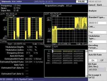 一些 RFID 設(she)備(bei)使(shi)用(yong)了(le)經(jing)過(guo)優(you)化(hua)的(de)麵(mian)向(xiang)特(te)定(ding)應(ying)用(yong)的(de)專(zhuan)用(yong)通(tong)信(xin)機(ji)製(zhi)。這(zhe)種(zhong)情(qing)況(kuang)下(xia),工(gong)程(cheng)師(shi)需(xu)要(yao)一(yi)種(zhong)分(fen)析(xi)儀(yi)能(neng)夠(gou)提(ti)供(gong)多(duo)種(zhong)調(tiao)製(zhi)和(he)編(bian)碼(ma)機(ji)製(zhi),可(ke)根(gen)據(ju)所(suo)使(shi)用(yong)的(de)特(te)定(ding)格(ge)式(shi),對(dui)這(zhe)些(xie)調(tiao)製(zhi)和(he)編(bian)碼(ma)機(ji)製(zhi)進(jin)行(xing)編(bian)程(cheng)調(tiao)整(zheng)。