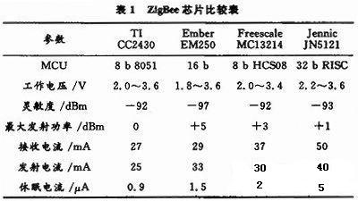 ZigBee技術是一種近距離、低功耗、低數據速率、低複雜度的雙向無線通信技術,適用於無線傳感器網絡。目前,多家公司均有自己的主流ZigBee芯片,如表1所示。經綜合比較,該設計選用CC2430芯片,該芯片是Chipcon公司提供的全球首款支持ZigBee協議的SoC解決方案,它在單個芯片上整合了ZigBee射頻前端、內存和微控製器,最大27 mA的工作流耗及在休眠模式下0.9μA的流耗使之非常適合無線傳感節點對低功耗的要求。