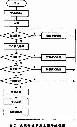 節點程序主流程如圖2所示,主要包括數據采集和無線通信兩個部分。出於傳感節點低功耗的考慮,軟件設計重點放在工作模式的處理上。