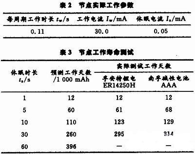 通過測試獲取節點工作參數如表2所示,工作電壓為3.3 V。kezhi,jiediangongzuoshiliuhaoda,zaixiumianzhuangtaizexiaodeduo。yinci,weibaozhengzaigongdiandianliangyouxiandeqingkuangxiahuodegengchangdegongzuoshouming,youbiyaojiangjiedianshezhiweijianxieshigongzuomoshi,jigongzuoxiumianzhouqixingjiaotijinxing。xiashiweijiedianshoumingyucegongshi: