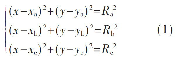 如圖3 所示, 在遊戲場館C 區內, 設編號分別為a 、b 、c 的三個有源讀寫器的位置為(xa,ya) , (xb,yb) , (xc,yc) ,遊客的位置坐標(x,y), 三個讀卡器到遊客的距離分別為Ra、Rb、Rc, 由時間信息定位方法(TOA) 可得式(1) , 即可求解遊客的位置坐標(x,y)。