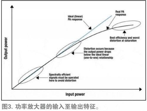 從圖3可以了解PA的工作原理。如藍線所示,理想的PA具有線性或一對一響應。比如,如果提高10%的輸入功率,那麼輸出功率也將相應提高10%。而現實世界中PA的性能如黑色曲線所示,PA性能在輸出功率處於極低水平的情況下與理想的PA一致,而在較高的輸出功率水平下則會下降至理想PA之下。例如,如果將現實世界中PA的輸入功率提高10%,其輸出功率僅會提高9%。因此,即使在輸入功率不斷提高的情況下,PA的輸出功率也將停止上升。