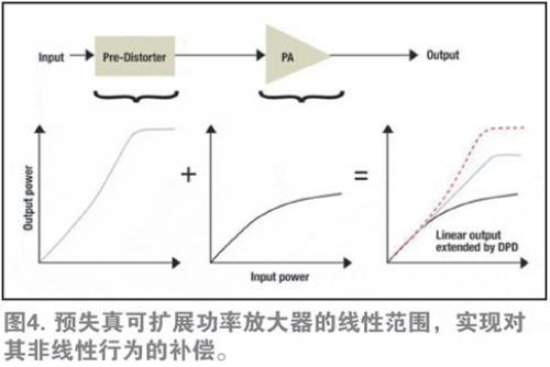 自適應DPD可以擴展寬頻帶射頻(RF)PA的直線性能(straight-line performance),而且遠遠超過正常擴展範圍。如前所述,當輸出功率增加時,輸出功率與理想線性性能曲線發生偏離。這正是PA放大輸出信號出現失真的地方,從而導致信號質量下降及幹擾。DPD可將PA失真輸出信號與非失真輸入信號進行比較。然後,將輸出信號中一個與失真正好對立的信號添加至輸入,從而有效消除失真。由於DPD可擴展PA的線性範圍,因此將其稱為線性化技術(如圖4)。