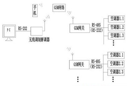 圖中係統可分為4部分;(1) PC(包括一個通過串口連接的無線調製調解器)或手機,通過GSM網絡發送或接收數據;(2)GSM網絡;(3) GSM網關,是PC和家電通訊的橋梁;(4) 網絡家電,可以是網絡空調、冰箱、電熱器具、電動窗簾等(下以空調為例)。