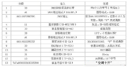 (1)記錄發送方手機號碼(上表第6、7部分),以便回複短信;(2)根據短信編碼方式(第8部分),對短信內容進行解析。因編碼方式有7位、8位和16位(USC2),解碼程序也就不一樣(程序略);(3)進行密碼校驗,如密碼不正確,則直接將其刪除;(4)進(jin)行(xing)密(mi)碼(ma)校(xiao)驗(yan)通(tong)過(guo),且(qie)短(duan)信(xin)內(nei)容(rong)符(fu)合(he)相(xiang)關(guan)約(yue)定(ding),則(ze)將(jiang)短(duan)信(xin)命(ming)令(ling)以(yi)特(te)定(ding)協(xie)議(yi)格(ge)式(shi)轉(zhuan)發(fa)給(gei)相(xiang)應(ying)空(kong)調(tiao),並(bing)將(jiang)該(gai)短(duan)信(xin)刪(shan)除(chu)。因(yin)此(ci),網(wang)關(guan)收(shou)到(dao)上(shang)麵(mian)短(duan)信(xin)後(hou),就(jiu)將(jiang)開(kai)機(ji)命(ming)令(ling)發(fa)給(gei)10號空調;(5)在規定時間內,空調未返回執行結果,網關將重發。如重發3次仍沒返回,則識係統通訊故障。