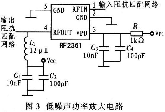 以低噪聲功率放大器RF2361為核心設計的低噪聲功率放大電路,如圖3所示,其VPD引腳上的並聯電容器實現電源VPD的濾波,RFOUT引腳上的電感電容串並聯網絡可對電源VCC濾波。