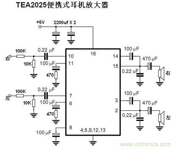 3,TEA2025使用手冊上推薦的線路,是作為小型功率放大器的應用,電壓增益高達52分貝,不適合直接做耳放。我在它的第6,第11腳對地串入了470歐姆的電阻以降低增益。